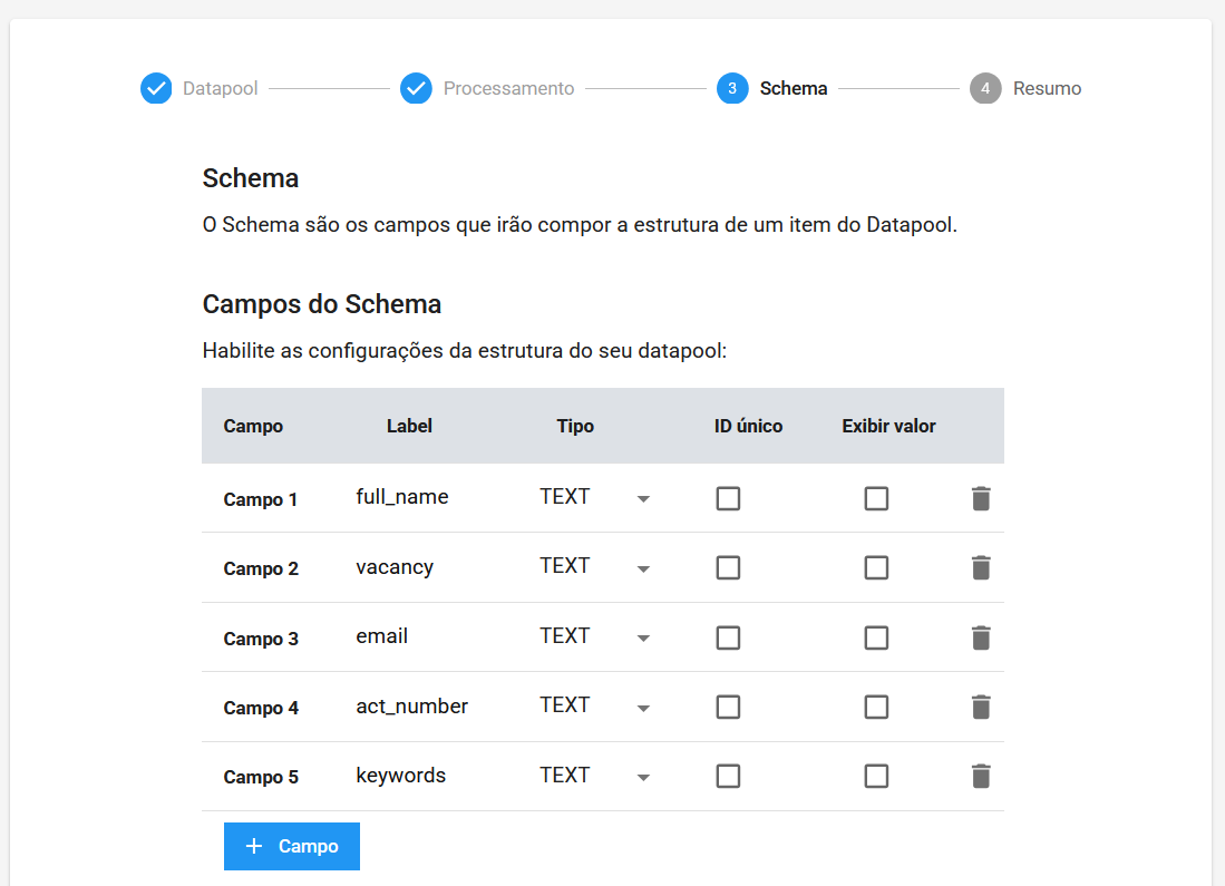 - Exibir valor: Se marcado, o valor desse campo será exibido na lista de itens do Datapool, servindo como um identificador visual para os itens em questão.
