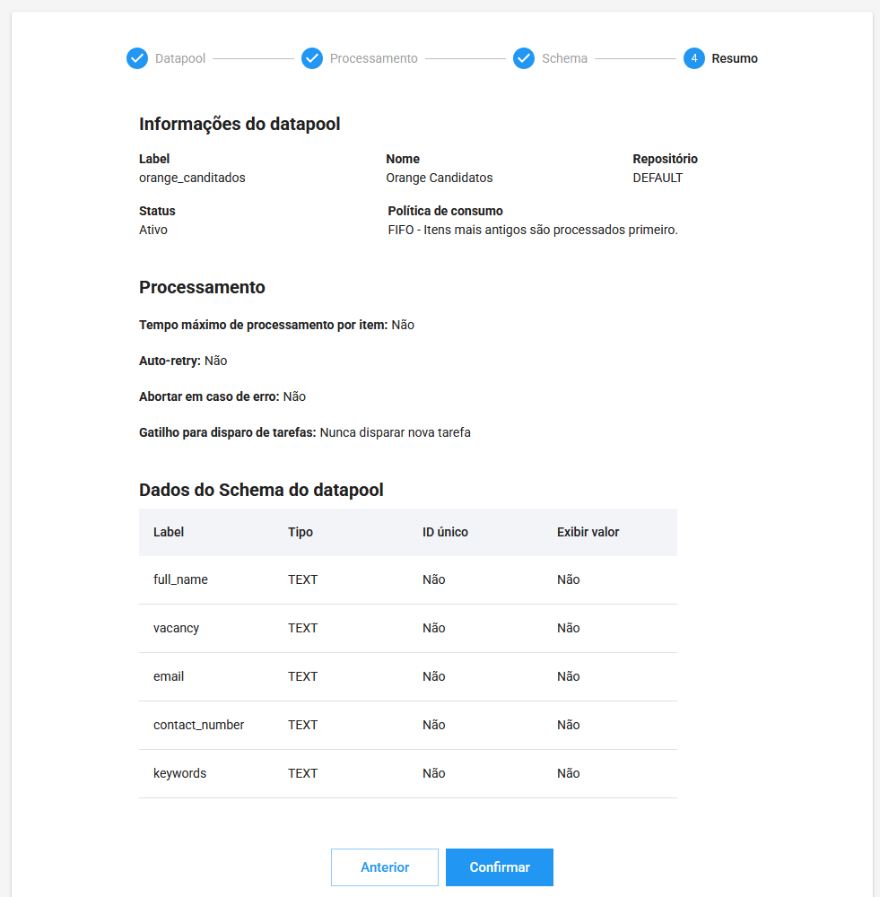 - Automação: O processo de automação que será utilizado pelo Datapool para disparar novas tarefas, se algum gatilho estiver sendo utilizado.
