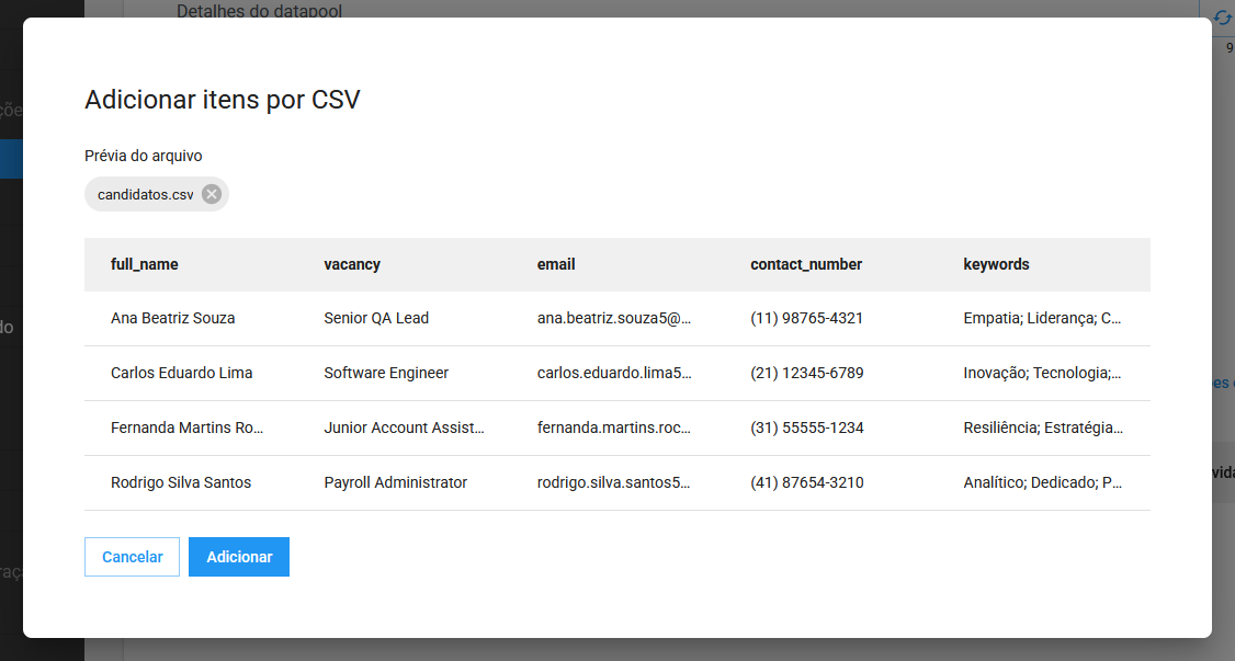 Uma forma mais eficiente de adicionar itens é por um arquivo .csv. Para isso, clique em Importar CSV e arraste o arquivo ou clique para selecionar.