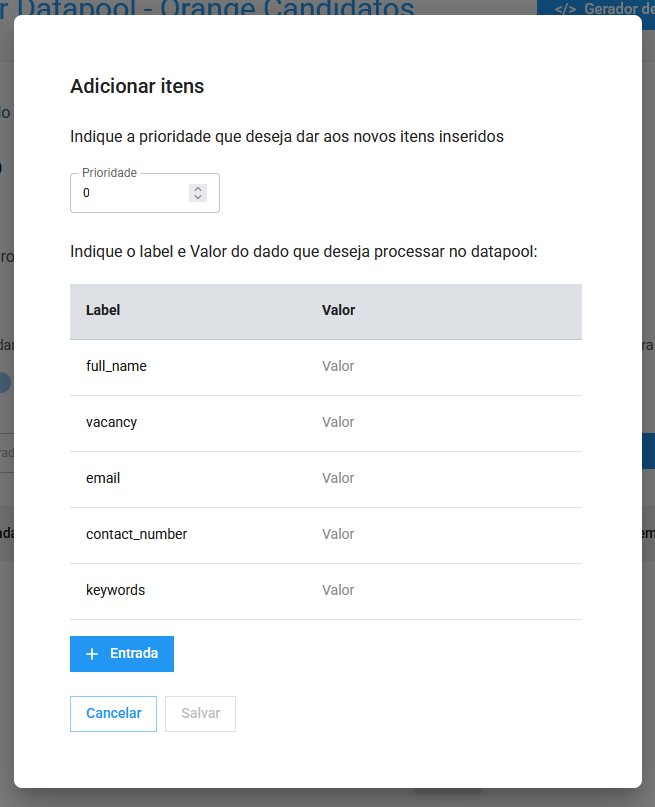 Para adicionar manualmente, clique em + Adicionar entrada, depois em + Adicionar, informando o label, o value e também a prioridade de um item.